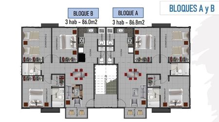 - 4 tipos de apartamentos de 2 y 3 habitaciones: Bloques A, B, C y D